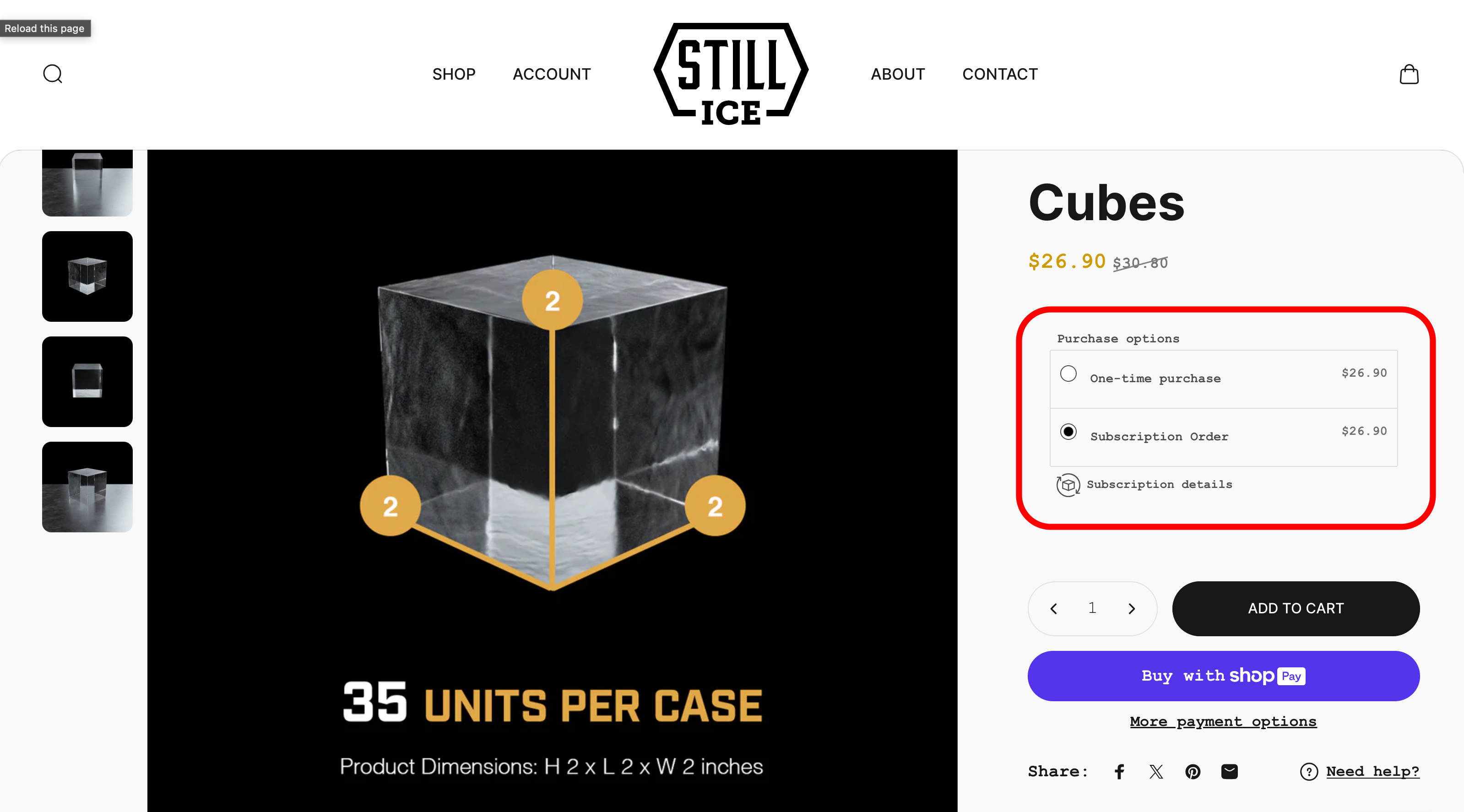 The default purchase option is set to "One-Time Purchase" for all products. This option must changed for each product in orders that include different items.
