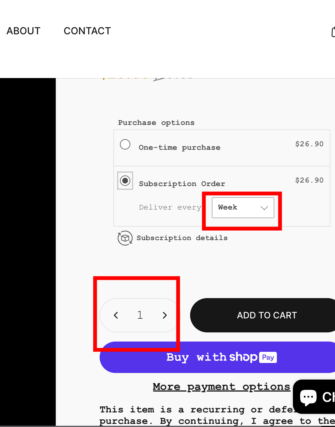 In the product page, before adding the order to the cart - change the purchase option by selecting, "Subscription Order" to enable auto-ordering configurations.